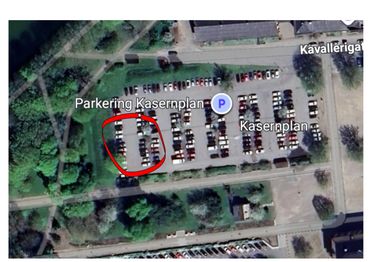 Se bifogad foto för att hitta rätt parkering. Vi parkerar längst bort på parkeringen.